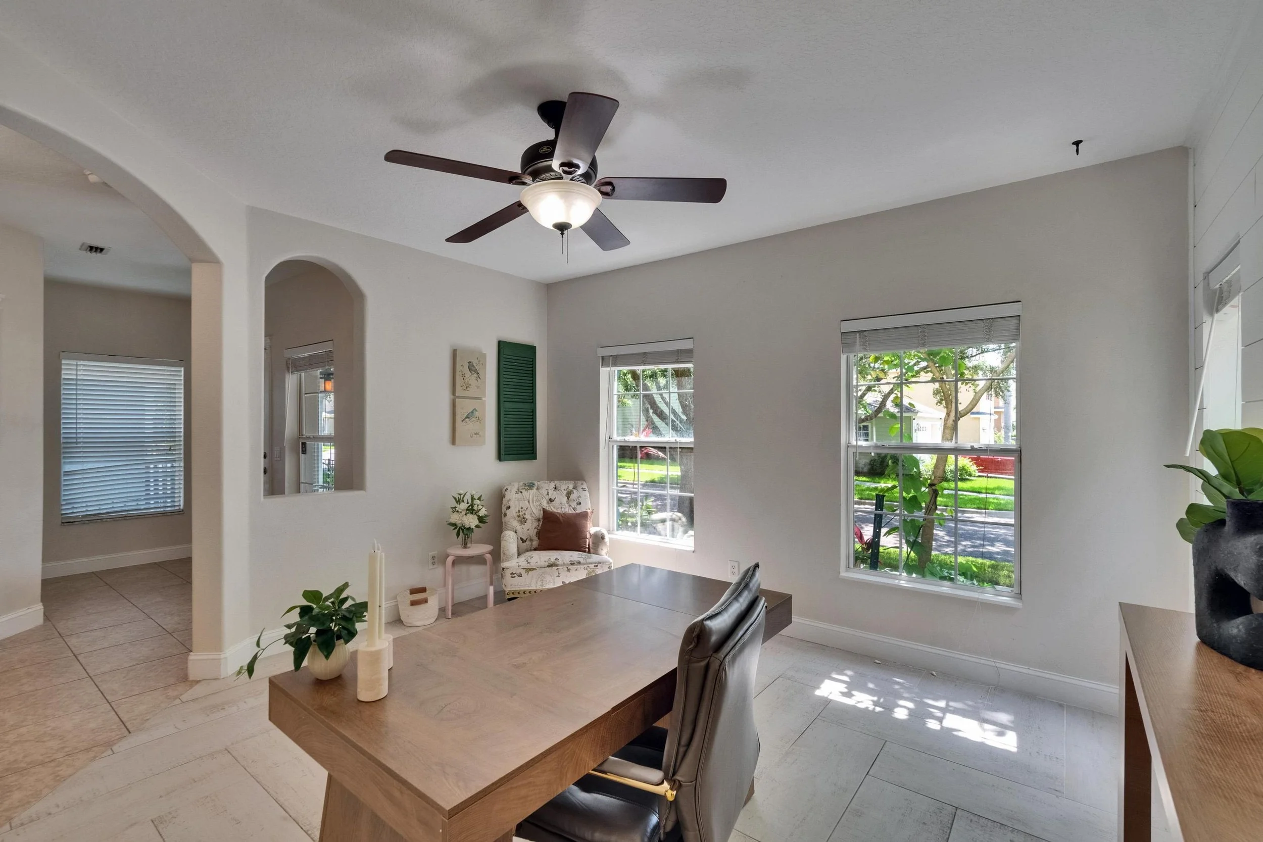 Crisp and inviting, this front office features shiplap walls, warm wood tones, and floral upholstery for a refined Southern work-from-home retreat. The layout captures both natural light and symmetry for stunning photography.
